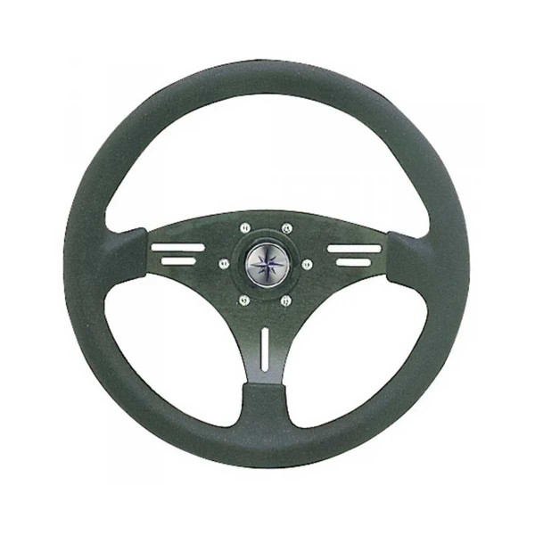 Das schwarze Manta-Lenkrad mit Speichen aus eloxiertem Aluminium, einem Kranz aus weichem Polymethan und silbernen Beschlägen verleiht Ihrem Boot einen eleganten und modernen Touch.