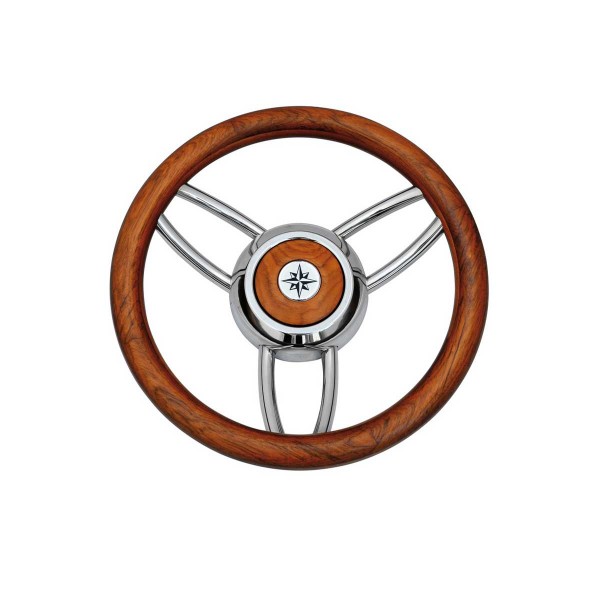 Mit seinem Gestell aus poliertem Edelstahl und seinem Kranz aus mattem Teakholz besitzt das Steuerrad Blitz ein elegantes und modernes Design für Ihren Steuerstand.