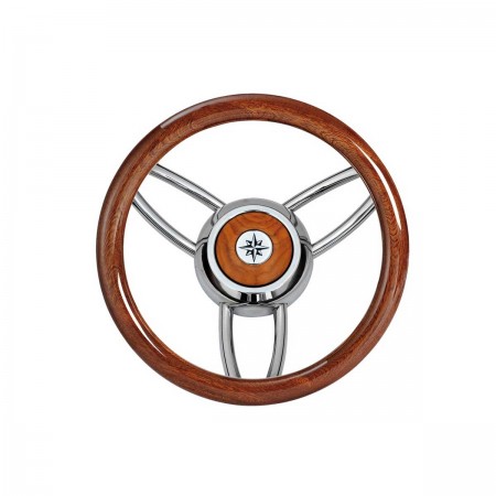 Mit seinem Gestell aus poliertem Edelstahl und dem Kranz aus poliertem Mahagoni besitzt das Lenkrad Blitz ein elegantes und modernes Design für Ihren Steuerstand.