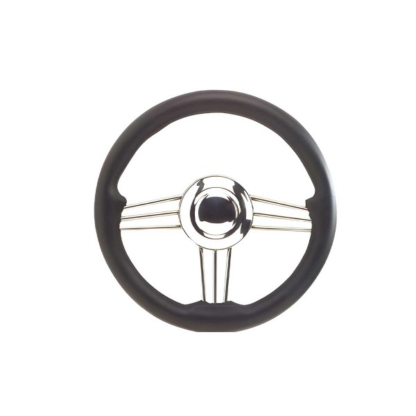 Das Lenkrad mit einer Struktur aus hochglanzpoliertem Edelstahl hat einen schwarzen Polyurethankranz mit einem Durchmesser von 35 cm und eine zentrale Nabe mit Universalkonus für die Montage auf vielen Booten.