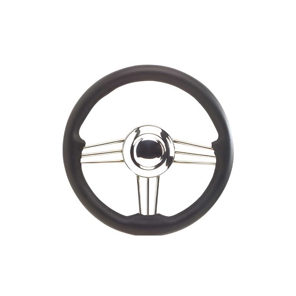 Das Lenkrad mit einer Struktur aus hochglanzpoliertem Edelstahl hat einen grauen Polyurethankranz mit einem Durchmesser von 35 cm und eine zentrale Nabe mit Universalkonus zur Montage auf vielen Booten.
