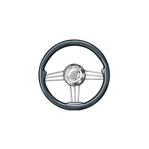 Das Lenkrad T14 mit einer Struktur aus hochglanzpoliertem Edelstahl besitzt einen schwarzen Kranz mit Karboneffekt und einem Durchmesser von 35 cm sowie eine zentrale Nabe mit Universalkonus zur Montage auf zahlreichen Booten.