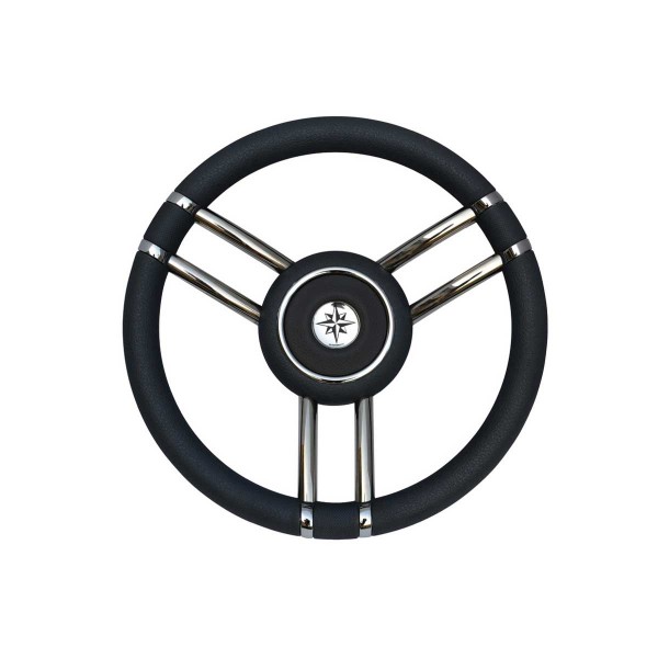 Das Apollo-Lenkrad hat drei Speichen aus poliertem Edelstahl und einen schwarzen Kranz mit Ø 35 cm aus Polyurethan, der für einen besseren Halt und eine hohe Seefestigkeit sorgt.