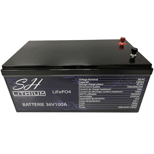 Die Lithiumbatterie LifeP04 36V 100A SH LITHIUM ist in einem klassischen Monoblockformat in einer wasserdichten IP67-Schutzbox verpackt.