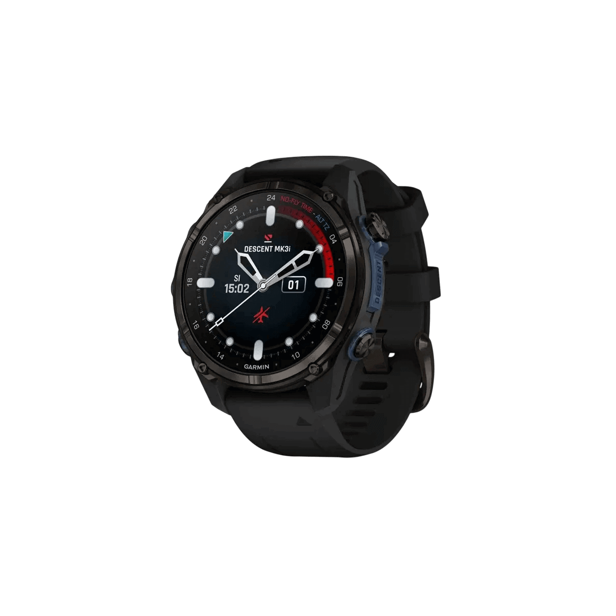 Die vernetzte Taucheruhr Garmin Descent Mk3i, hat ein 43 mm Carbon Gray Gehäuse, einen hellen 390px*390px AMOLED-Bildschirm mit extrem widerstandsfähigem Saphirkristallglas, eine Lünette aus Edelstahl, ein schwarzes Silikonarmband und 32 GB Speicherplatz.