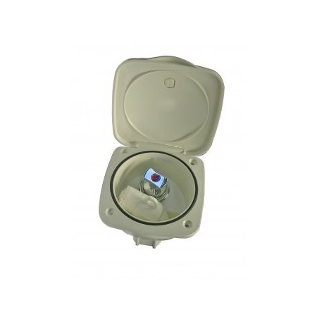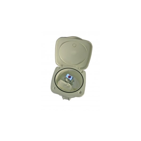 Weiß mit einem Deckel zum Aufklipsen, dieser ist mit einem O-Ring ausgestattet, um eine optimale Spritzwasserbeständigkeit zu gewährleisten.