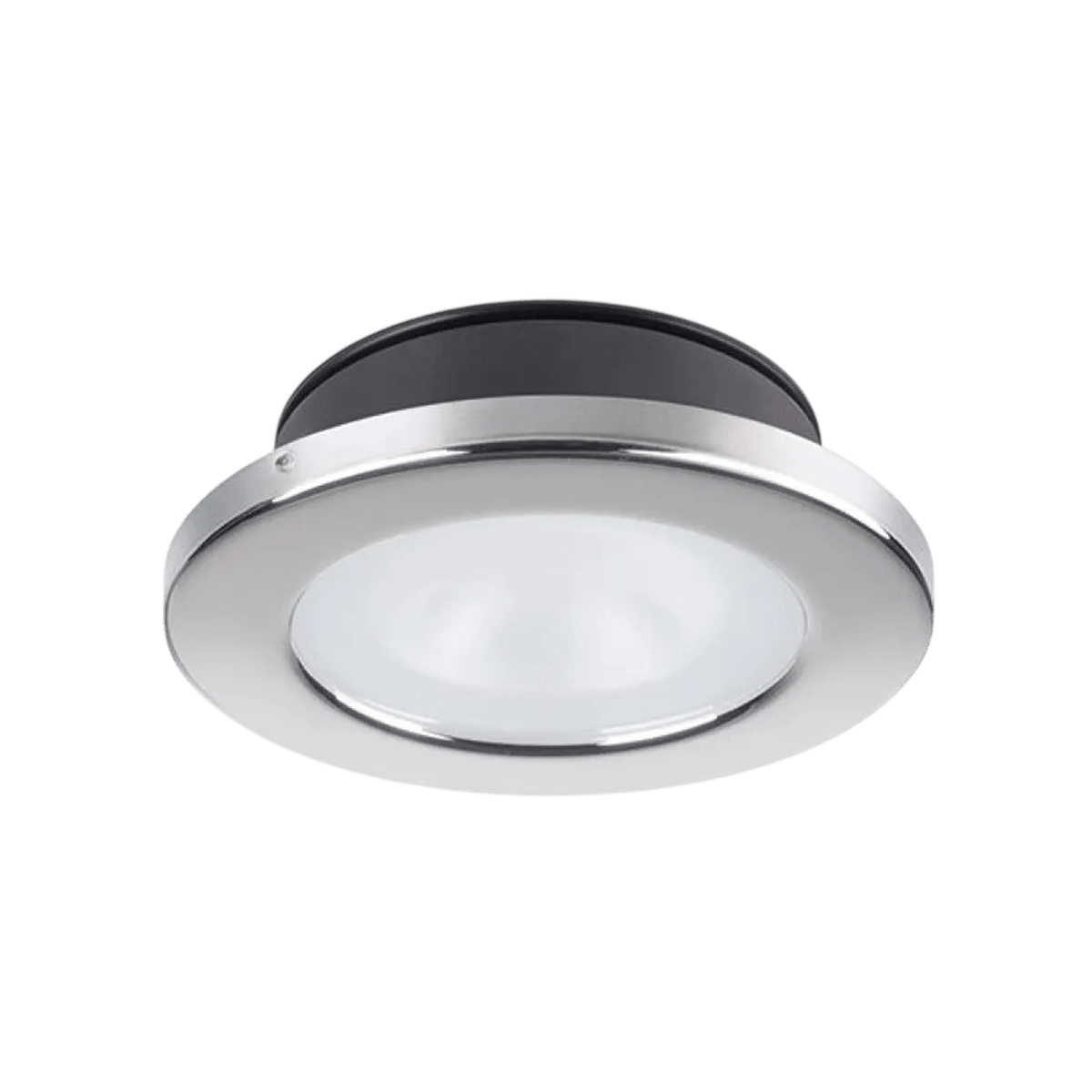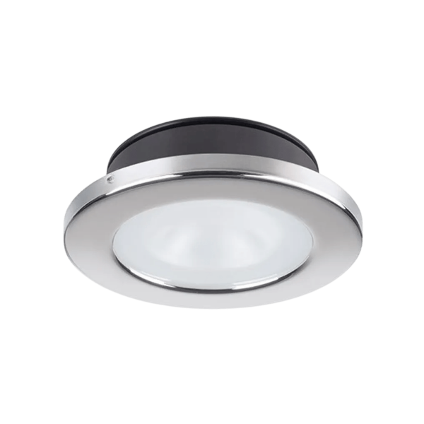 Weiße LED-Deckenleuchte CHIARA zum Einbauen, 4 W, für Netzteil 9-32 V DC. Mit ihrer warmweißen Beleuchtung von 3000 K, einem Lichtstrom von 350 lm und der Schutzart IP66 eignet sie sich perfekt für die Innen- und Außenbeleuchtung in Meeresumgebungen. Gesamtdurchmesser: 88 mm, Einbaudurchmesser: 65 mm.
