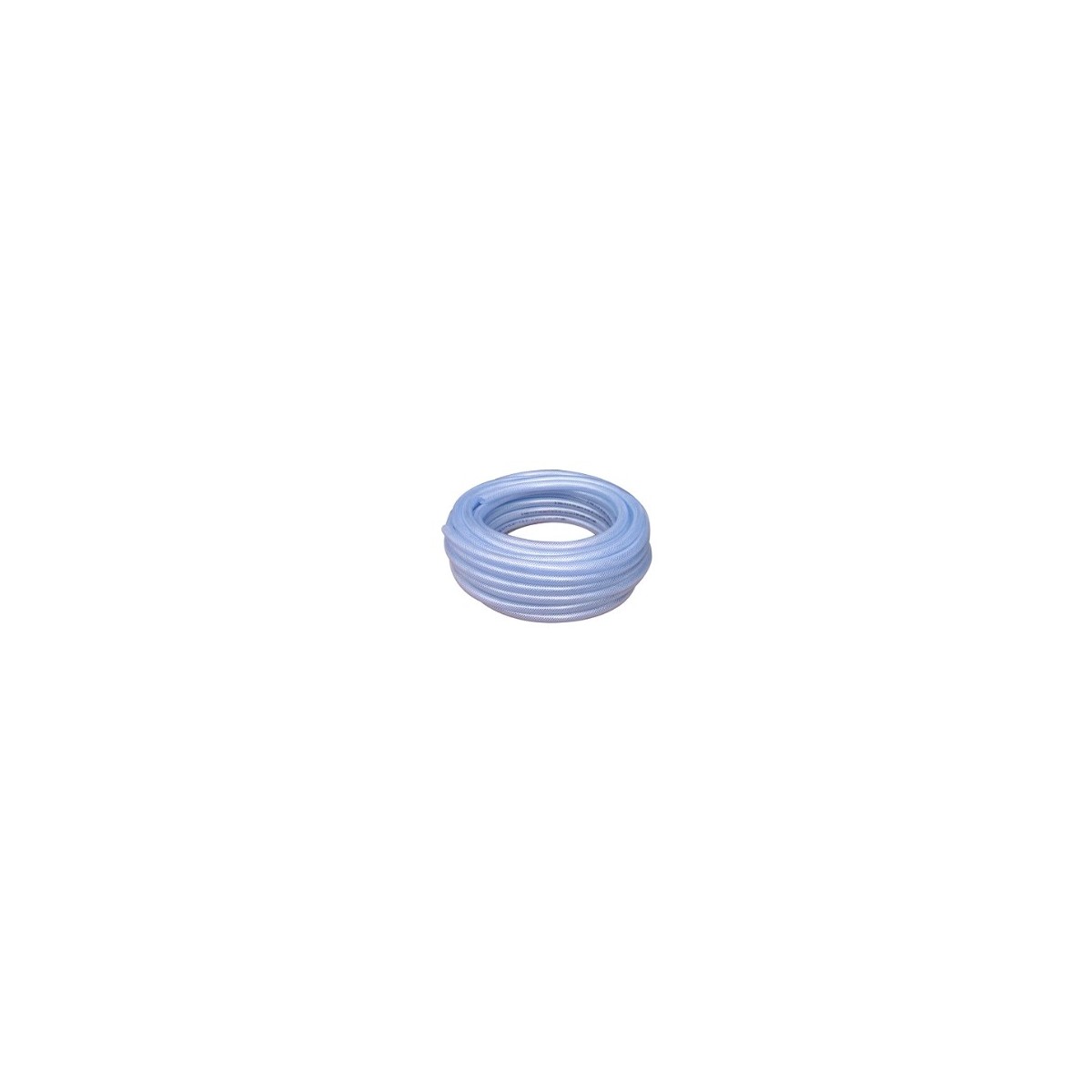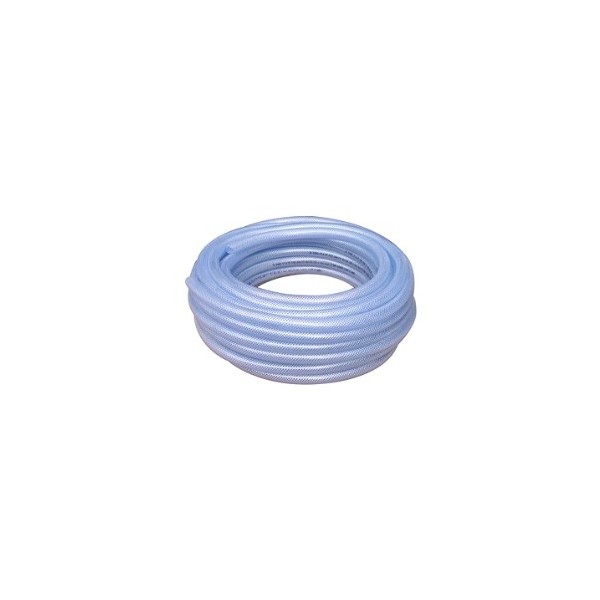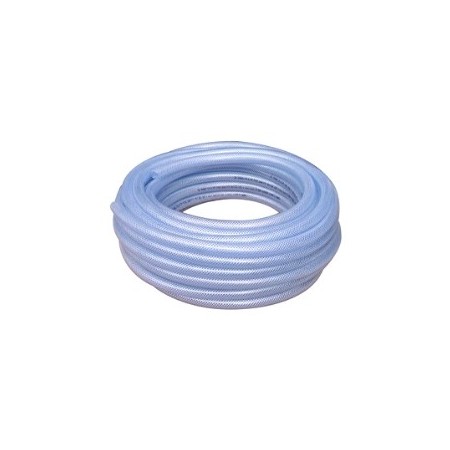Farbloser, transparenter Allzweckschlauch aus lebensmittelechtem PVC, der mit einem Geflecht verstärkt ist.