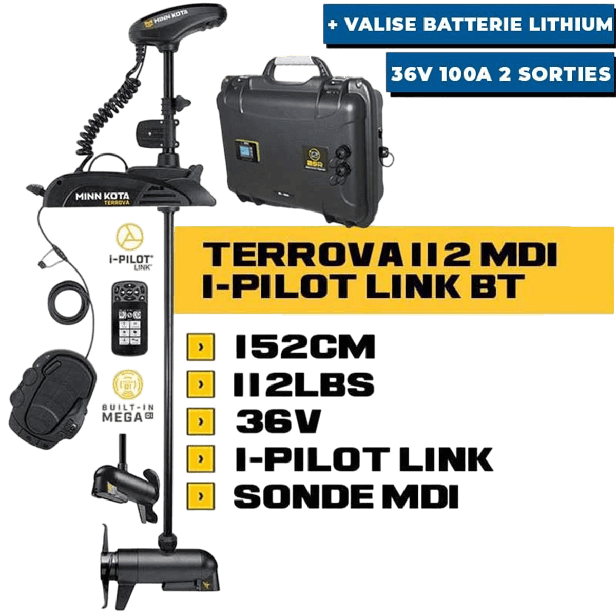 Comptoir Nautique bietet auch komplette Pakete mit dem Frontmotor Minn Kota Terrova MDI BT + Pedal + I-Pilot Link mit Lithium-Kofferbatterien an BSR: